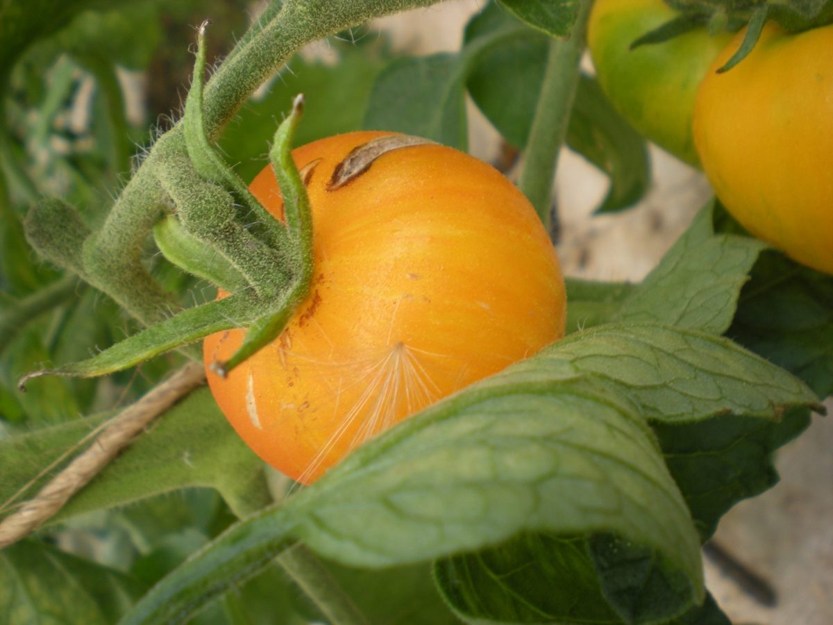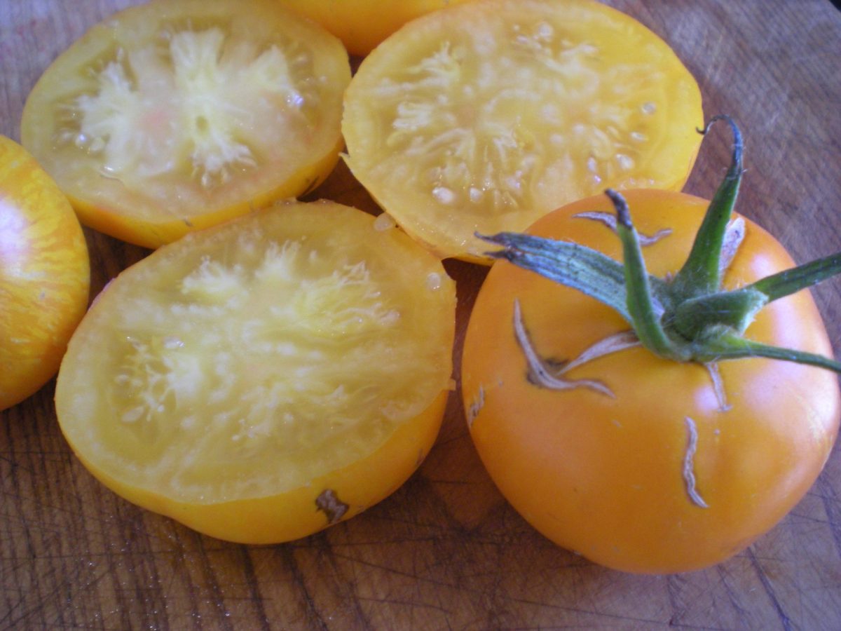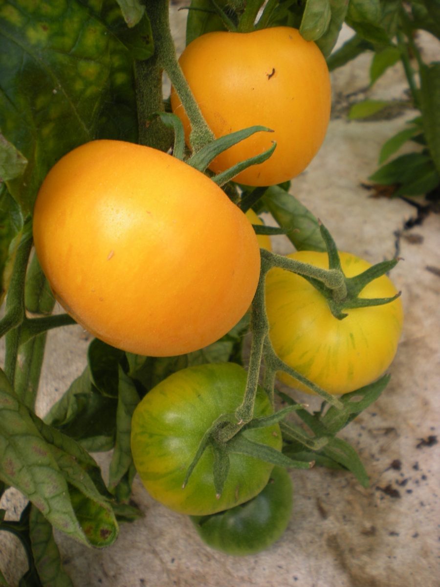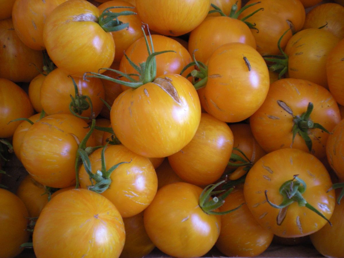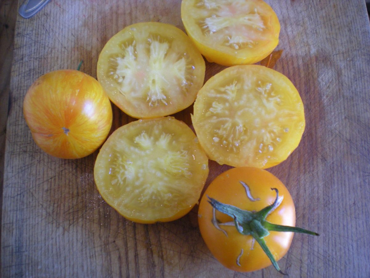 Tomate vigoureuse et productive. Fruits moyens ronds, jaunes striés de orange. Saveur épicée a la chair verte et fondante.
